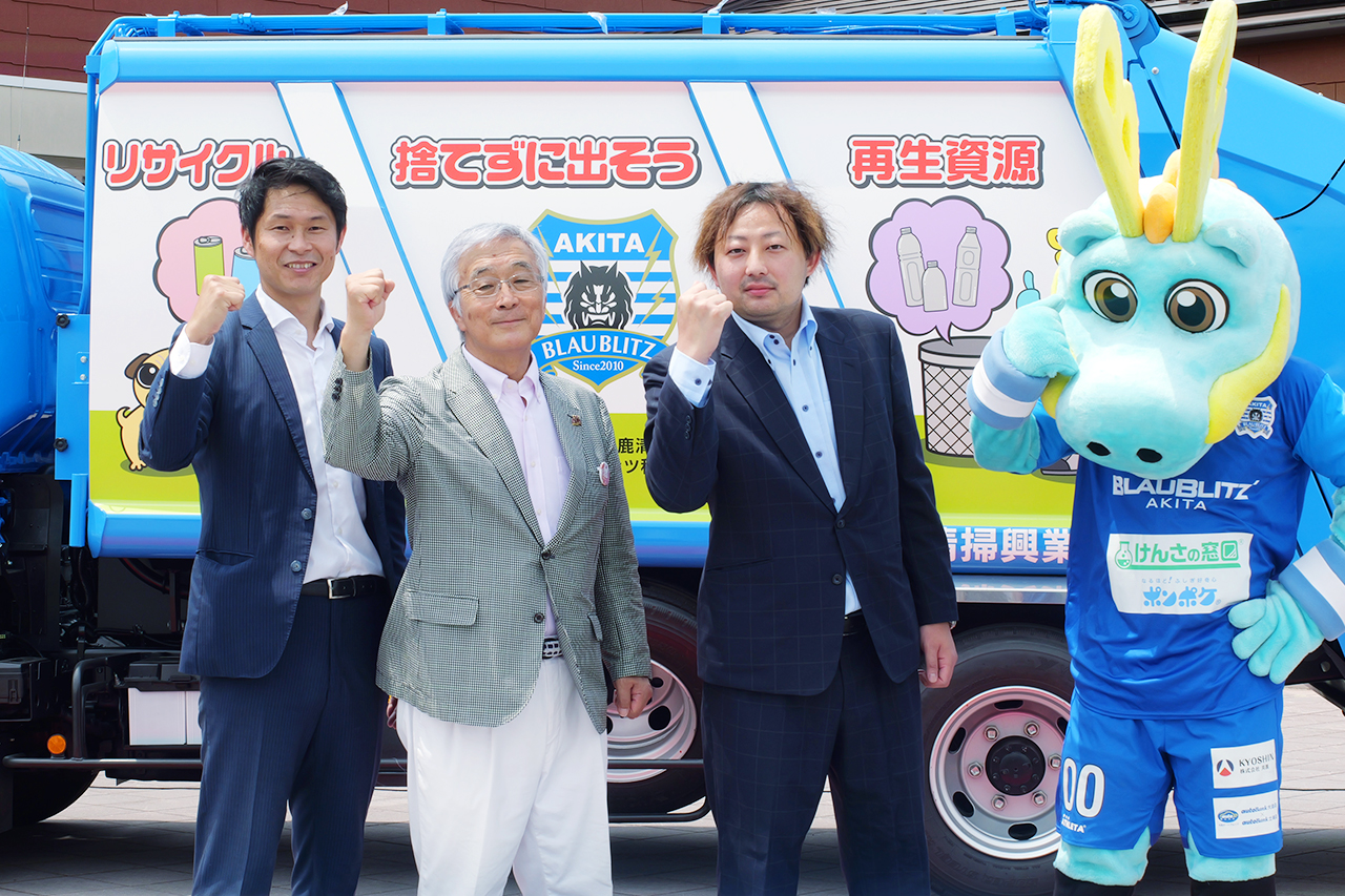 6月21日(土)、男鹿市「道の駅オガーレ」にて、ブラウブリッツ秋田様の「ブラウゴン」をラッピングしたゴミ収集車(パッカー車)のお披露目会を実施いたしました。